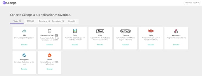 Desde la sección Integraciones de tu chatbot, podrás visualizar diferentes opciones para Integrar los contactos generados a través de Cliengo a otras Aplicaciones.