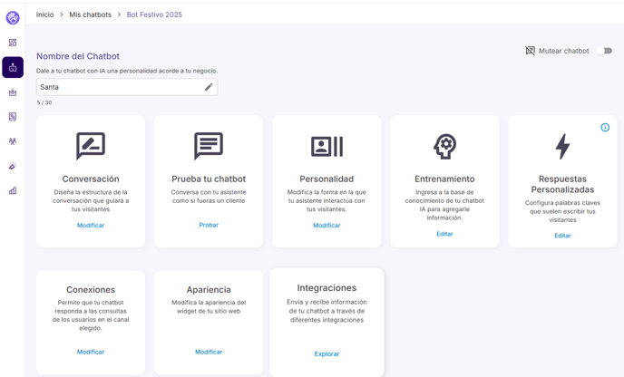 Desde la sección Integraciones, por ejemplo, podés enriquecer y escalar las conversaciones generadas conectándolas con CRMs especializados según el rubro de tu negocio. Soluciones como Tokko, Tecnom o Pilot se integran de forma nativa, de manera simple y directa.