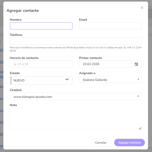 Todos los campos pueden variar según la sección donde estés creando el nuevo contacto.