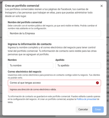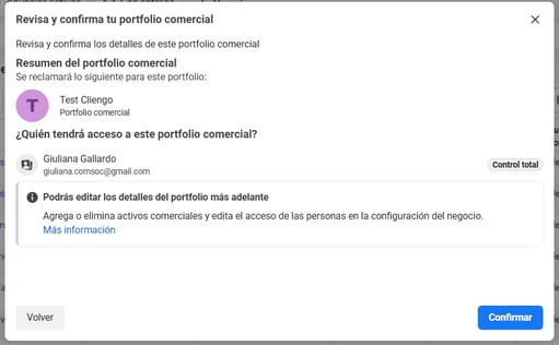 ⚠️ IMPORTANTE: Ve a tu email y busca el correo de Meta con el asunto "Confirma el correo electrónico de tu negocio". Haz clic en el botón de confirmar; sin este paso, no podrás conectar activos.