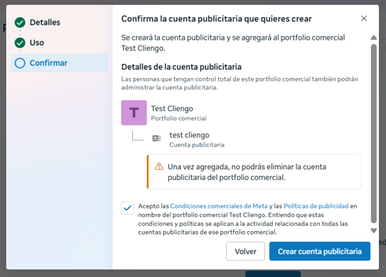 Finalmente presiona el check para Aceptar las Condiciones comerciales de Meta y las Politicas de publicidad y posteriormente presiona "Crear cuenta publicitaria".