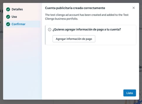 Cuando presiones "Crear cuenta publicitaria" te aparecerá la siguiente pantalla que viene relacionada al punto 4. Te recomendamos que ahí mismo presiones "Agregar información de pago".