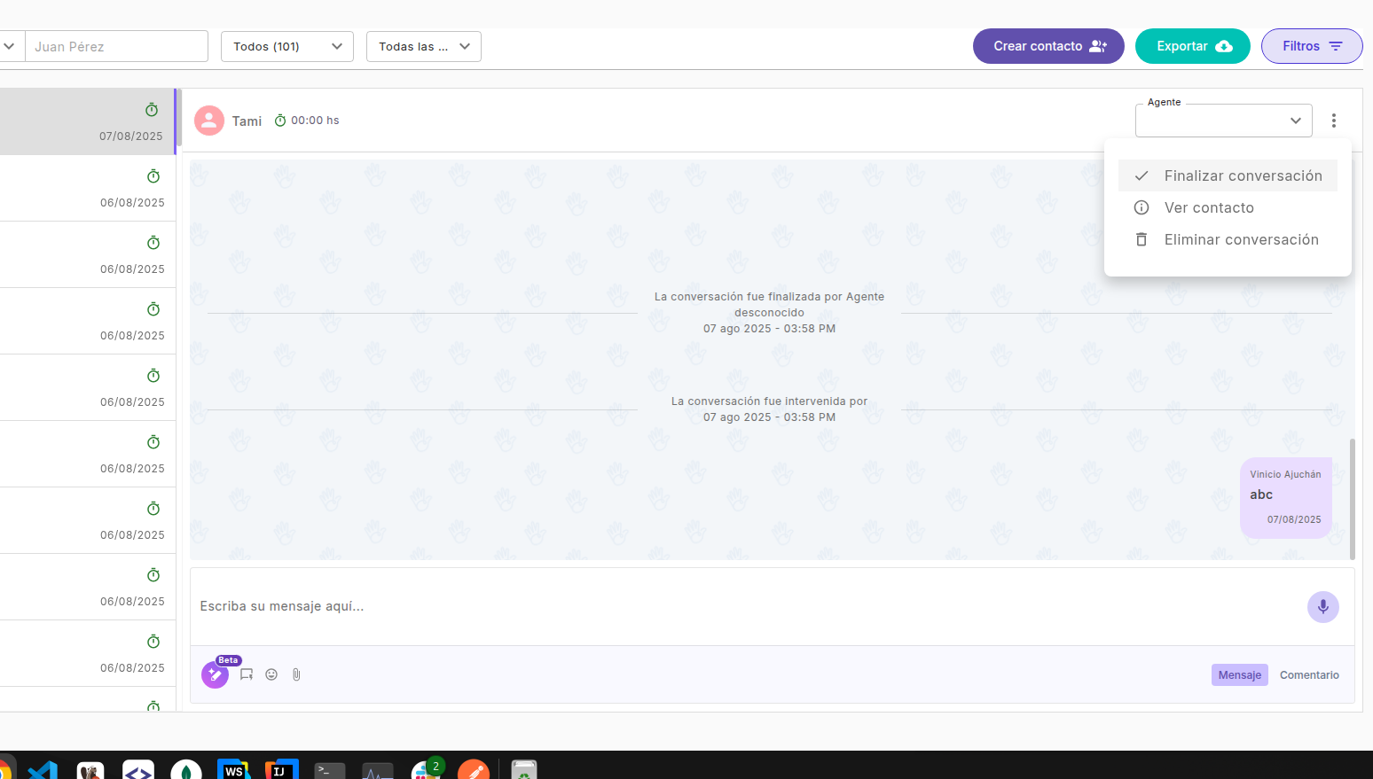Se agregó la acción “Eliminar” en el menú de acciones de cada conversación.