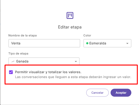 Ahora cada etapa del embudo puede configurarse para mostrar o no valores monetarios.