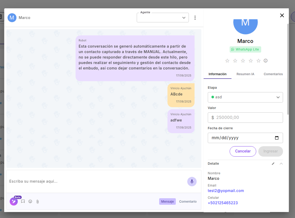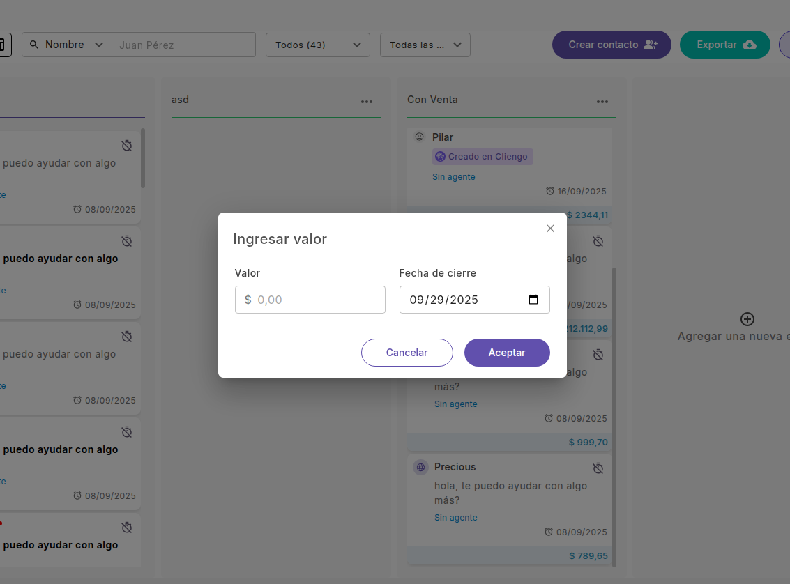 Al mover una conversación se solicita ingresar valor y fecha de cierre.