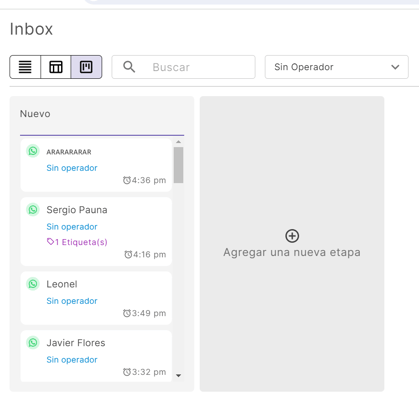 - Embudo: Esta vista permite mover las conversaciones a través de etapas predefinidas según tu negocio, facilitando la visualización completa del ciclo y optimizando la gestión desde el inicio hasta el cierre. Es la vista soñada por agentes que deben hacer un seguimiento en etapas y quieren visualizar el avance de sus clientes