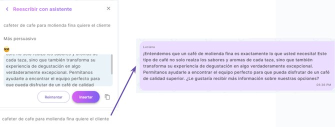 Si la opción propuesta te gusta, selecciona insertar y el texto se pondrá automáticamente en el campo de respuestas para que se envíe al cliente.